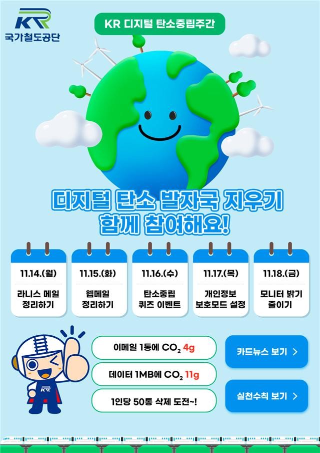[하비엔=문기환 기자] 국가철도공단은 디지털 탄소발자국을 줄이기 위해 전 직원을 대상으로 ‘디지털 탄소중립 캠페인’을 실시했다고 21일 밝혔다.
