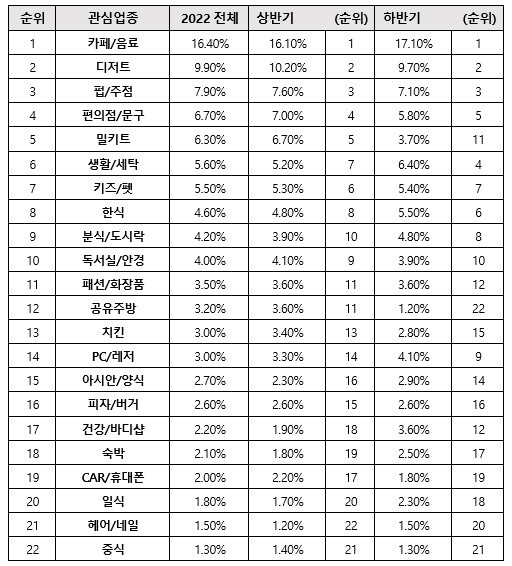 설문조사 결과 전체 업종 가운데 카페·음료 업종이 16.4%를 차지해 1위에 올랐다. 이어 디저트(9.9%), 펍·주점(7.9%), 편의점·문구(6.7%), 밀키트(6.3%), 생활·세탁(5.6%), 키즈·펫(5,5%) 등순이었다.