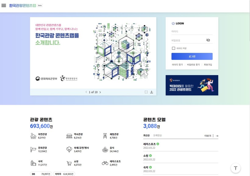 [하비엔=윤대헌 기자] 문화체육관광부와 한국관광공사는 28일 디지털 관광콘텐츠를 통합적이고 체계적으로 생산·관리·개방하기 위해 개방형 플랫폼 ‘한국관광 콘텐츠랩’의 베타서비스를 오픈했다.