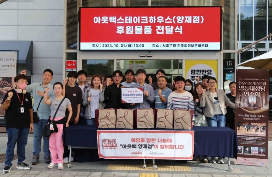 | 지난 1일 아웃백 양재점이 서초구립 한우리정보문화센터에서 후원 물품 전달식을 가졌다. [사진=아웃백] |