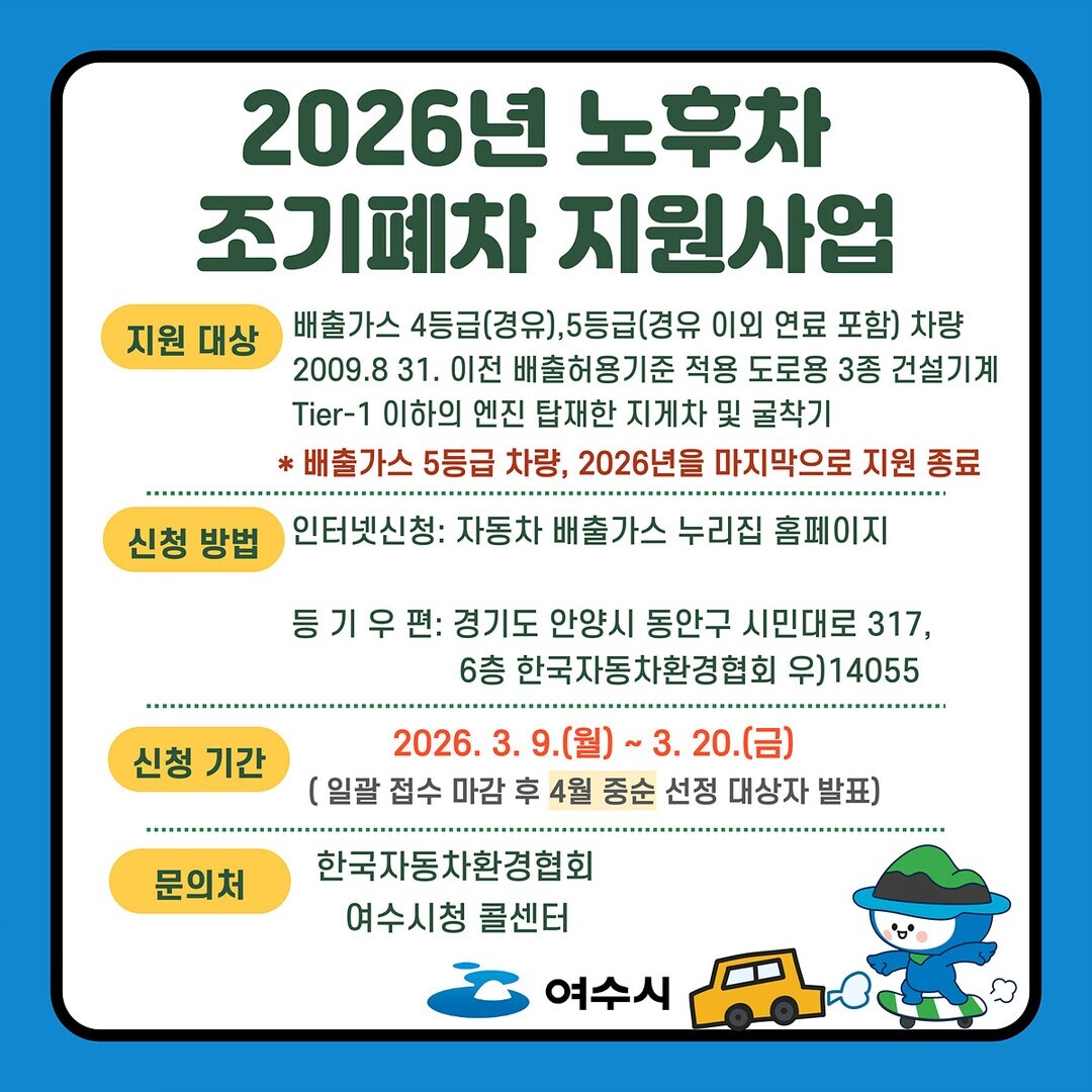 자세한 내용은 여수시 누리집 고시·공고를 통해 변경 기준을 확인한 후 신청 바라며 접수는 자동차 배출가스등급제 누리집을 통한 온라인 신청 또는 한국자동차환경협회로 우편 접수가 가능하다.