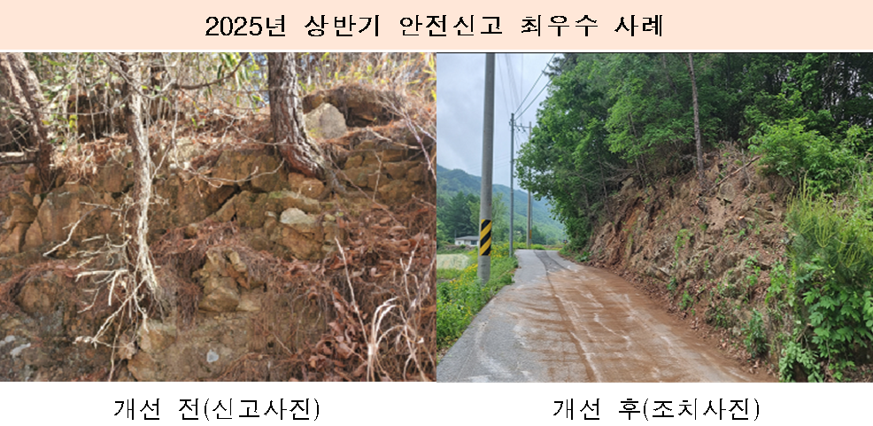 상반기 최우수 사례는 장수군 도로 급경사지에서 법면 낙석 및 붕괴 위험을 발견해 나무 제거를 제안한 사례로 해당 신고를 바탕으로 폭우 및 강풍 시 발생할 수 있는 붕괴를 예방했다.