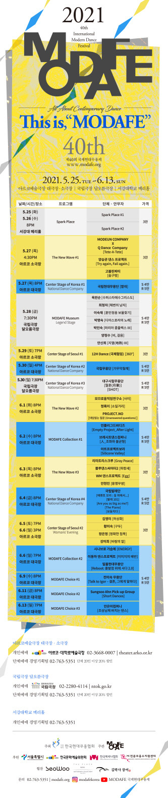 한편 ‘국제현대무용제 모다페’는 금년 40회를 맞아 ”All About Contemporary Dance. This is, MODAFE!”를 슬로건으로 국내 최정상 현대무용가들과 함께 5월 25일(화)부터 6월 13일(일)까지 20일간 아르코예술극장 대극장 및 소극장, 국립극장 달오름극장, 서강대학교 메리홀에서 관객과 만난다.