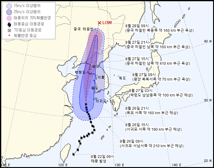 이에 제주도와 전남해안 태풍특보 발효됐으며, 최대순간풍속 100km/h(28m/s) 이상 매우 강한 바람 불고, 천둥.번개를 동반한 시간당 30mm 이상 매우 강한 비가 내리고 있다.
