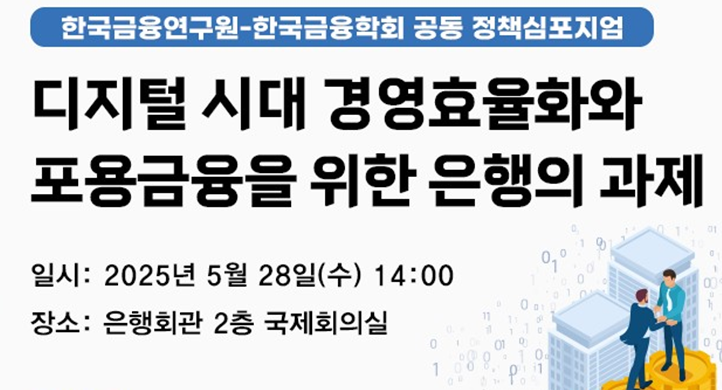 [하비엔뉴스 = 이동훈 기자] 한국금융연구원(원장 이항용)과 한국금융학회(회장 곽노선)는 5월 28일 오후 2시부터 4시 50분까지 서울 중구 명동 은행회관 2층 국제회의실에서 ‘디지털 시대 경영효율화와 포용금융을 위한 은행의 과제’를 주제로 공동 정책심포지엄을 개최한다.