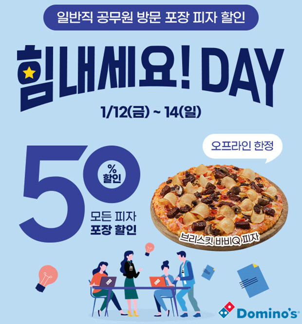 [하비엔뉴스 = 윤대헌 기자] 도미노피자는 새해를 맞아 오는 12~14일 일반직 공무원을 대상으로 ‘힘내세요! DAY’ 이벤트를 진행한다고 5일 밝혔다.