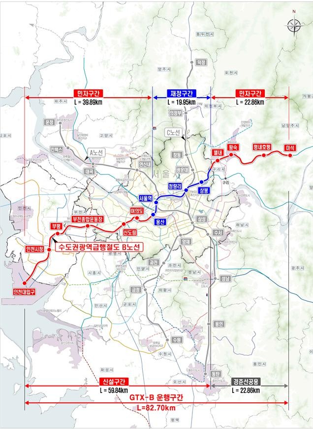 민자구간은 ‘인천대입구-용산’과 ‘상봉-마석’ 총 62.8㎞이고, 재정구간은 ‘용산-상봉’ 19.9㎞ 거리다.