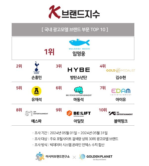 ‘K-브랜드지수’는 아시아브랜드연구소와 골든플래닛이 자체 개발한 빅데이터 시스템을 통해 산출된 것으로, 지난 5월1~31일 사이 온라인 빅데이터를 기반으로 분석됐다.