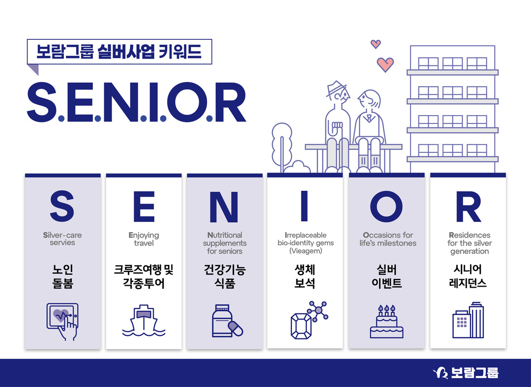 보람그룹은 향후 실버케어의 방향성을 의미하는 키워드로 ‘시니어(S.E.N.I.O.R)’를 제시하며 관련 사업을 본격 추진한다고 21일 밝혔다.