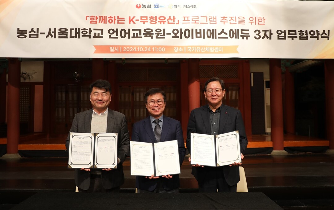 [하비엔뉴스 = 윤대헌 기자] 농심은 지난 24일 서울대 언어교육원·YBS에듀와 외국 유학생에게 한국무형유산 체험 기회를 제공하는 ‘함께하는 K-무형유산’ 프로그램 추진을 위한 업무협약을 맺었다고 25일 밝혔다.