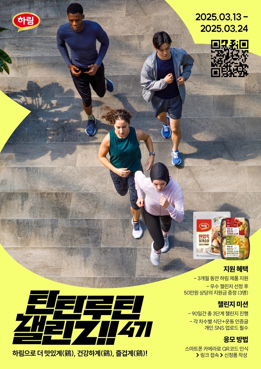 [하비엔뉴스 = 윤대헌 기자] 하림은 오는 24일까지 소비자와 임직원의 건강한 일상을 응원하기 위해 ‘탄탄루틴 챌린지’ 4기 참가자를 모집한다고 14일 밝혔다.