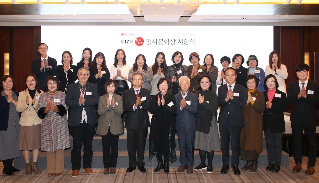 | ‘제17회 삶의향기 동서문학상’ 시상식에서 수상자와 관계자들이 함께 기념촬영을 하고 있다. [사진=동서식품] |