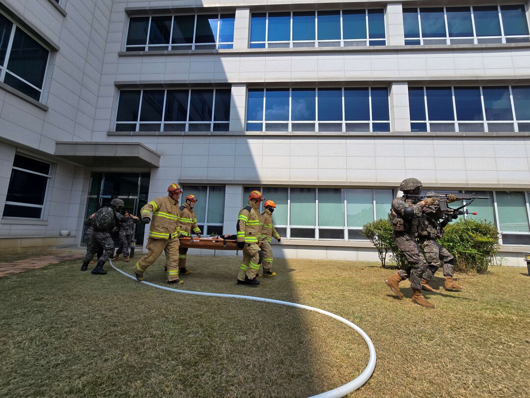 | 사진 = 육군 35사단 충무여단 장병이 8월 20일 25 UFSTIGER 연습 일환으로 한국전력공사 전북본부에서 실시한 통합방위훈련 간 소방대원들과 함께 부상자를 후송하고 있다 |
