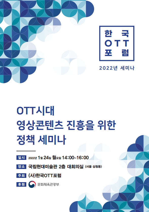 한국OTT포럼은 오는 24일 오후 2시 서울 삼청동 국립현대미술관에서 ‘OTT시대 영상콘텐츠 진흥을 위한 정책’ 세미나를 개최한다고 21일 밝혔다.