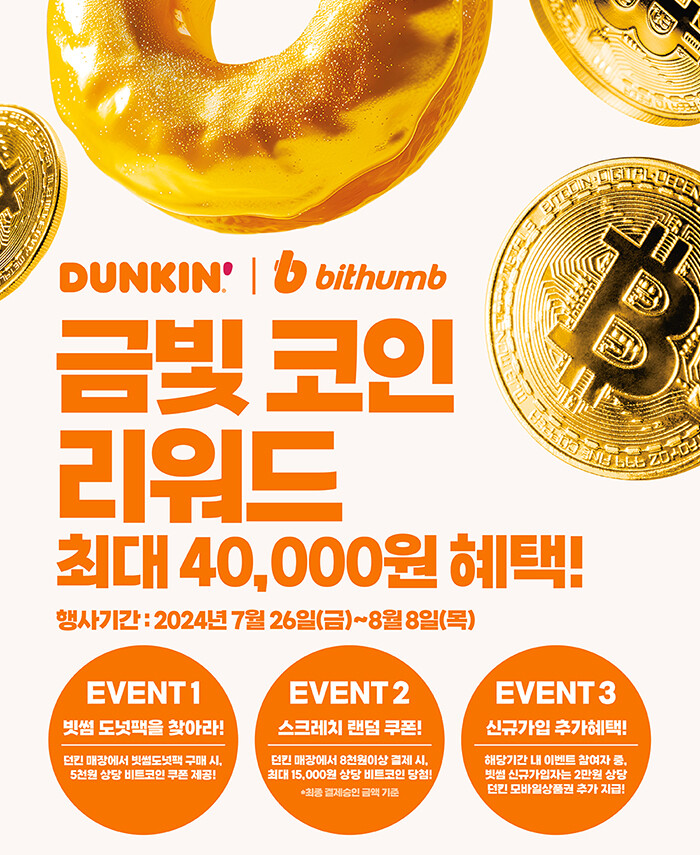 ‘금빛 코인 리워드’는 던킨 매장에서 제품을 구매하면 빗썸 앱에서 비트코인 쿠폰을 제공하는 이벤트다.