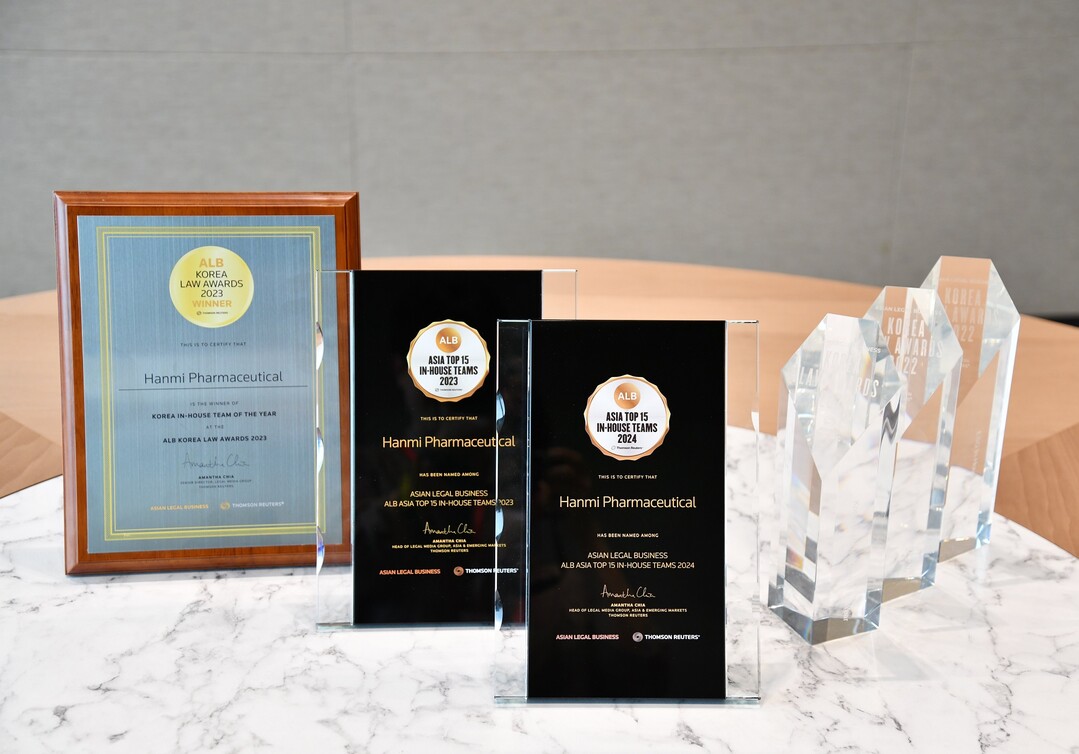 이 밖에도 한미약품 법무팀은 ALB가 주최한 ‘ALB Law 코리아 어워즈’에서 2022년에는 ‘올해의 혁신 법무팀(Innovative In-house Team of the Year)’과 ‘올해의 ESG 분야 법무팀(ESG In-house Team of the Year)’ 2개 부문에서 수상했으며, 2023년에는 국내 기업 법무팀 중 단 한 팀만이 선정되는 ‘올해의 법무팀(Korea In-house Team of the Year)’에 선정되는 영예를 안은 바 있다.