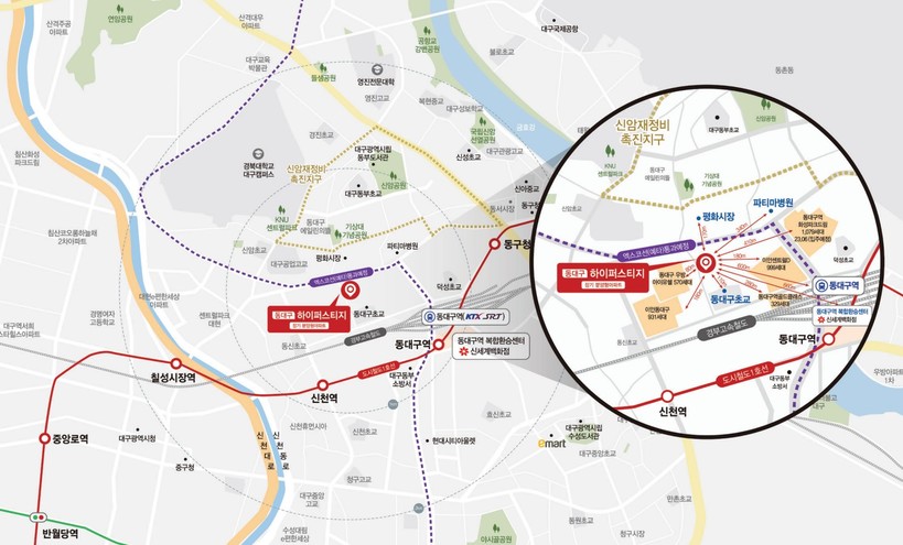또 100m 이내에 동대구 초등학교와 청구중·고등학교, 경북대학교가 자리하고, 이안동대구, 동대구 우방아이유쉘이 인접해 있다.