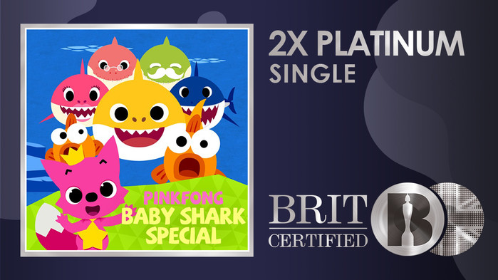 또한 핑크퐁 아기상어는 지난 9월 11일 영국음반산업협회(British Phonographic Industry, 이하 BPI)가 공식 홈페이지 및 SNS 채널에서 발표한 ‘브릿 서티파이드(BRIT Certified)’ 싱글 부문에서 120만건 이상 판매고를 올린 경우 받을 수 있는 더블 플래티넘(2X Platinum) 인증도 취득해 눈길을 끈다. 해당 부문에서 한국 콘텐츠가 더블 플래티넘 인증을 받은 것은 2013년 12월 싸이의 ‘강남스타일’ 이후 이번이 처음이다.