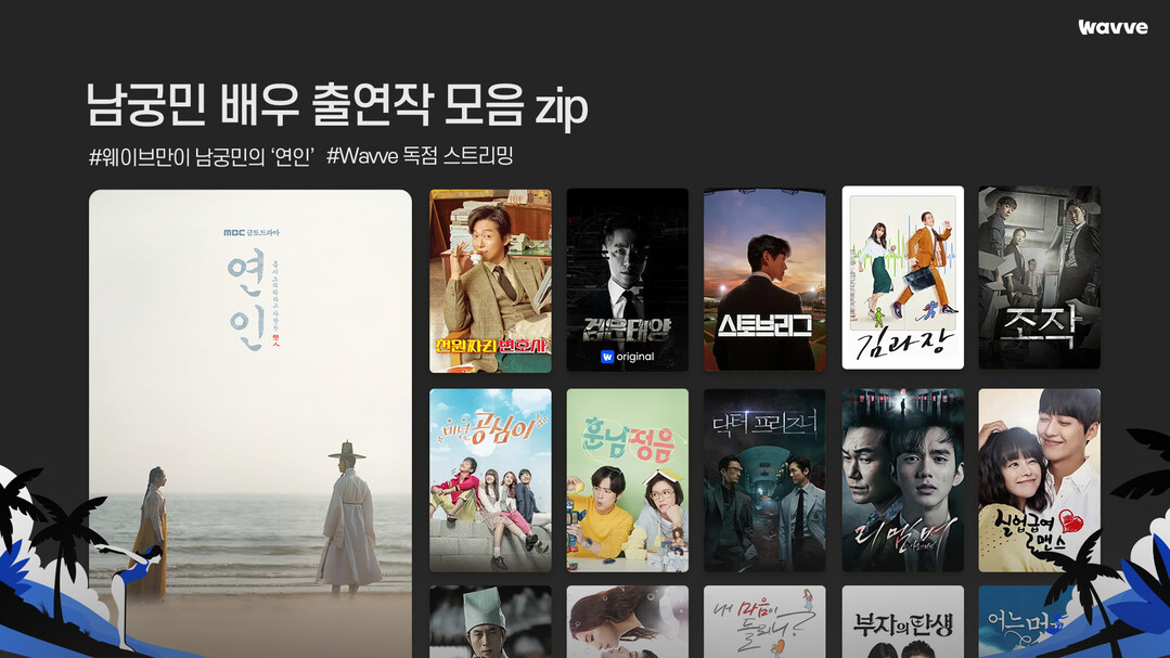 웨이브 월정액 이용자는 <연인>을 포함해 <김과장> <스토브리그> <검은 태양> <천원짜리 변호사> 등 16편의 남궁민 출연작을 무제한 감상할 수 있다.