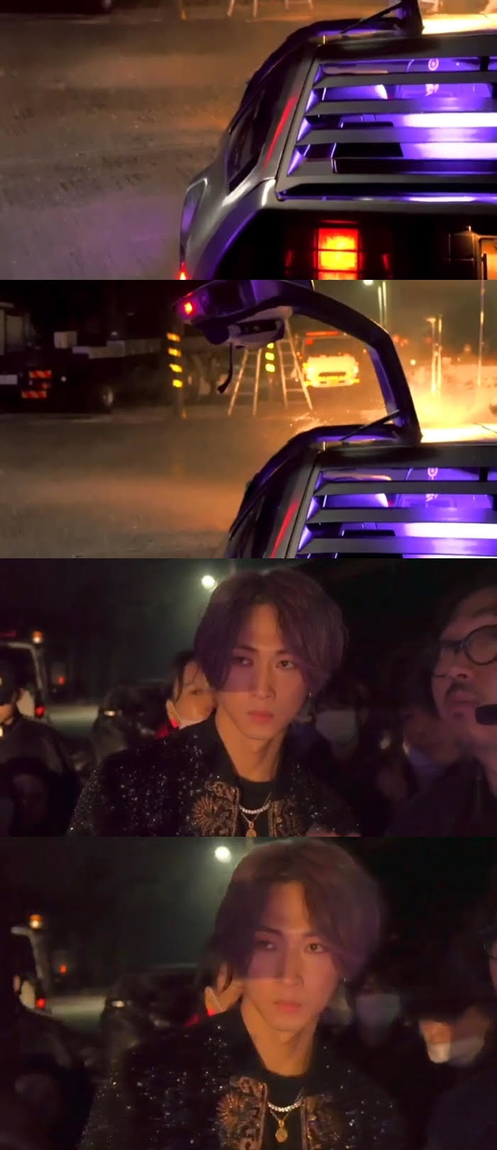 물이 뿌려지는 어두운 야외 촬영장에는 마치 안개가 흐르는 것 같은 빛의 막대와 영화 ‘백 투더 퓨처’를 연상케 하는 메탈릭한 슈퍼카가 자리하고 있다. 장우혁은 그 한가운데서 스태프의 설명을 들으며 진지하게 촬영을 준비하고 있는 모습이다.