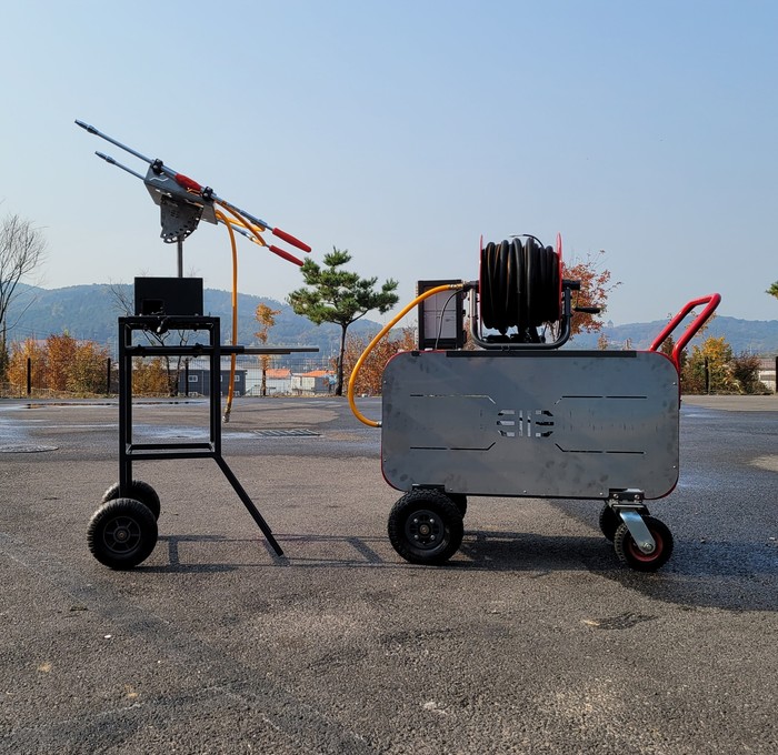 이 살수기는 자체 엔진을 부착해 이동이 쉽고 살수각 자동조절 기능과 스마트폰 원격 제어 기능으로 무인 살수가 가능하다.