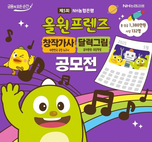 ‘올원프렌즈 공모전’은 농협은행 대표 캐릭터 ‘올리’와 ‘원이’를 활용해 새로운 콘텐츠를 제작하는 공모전으로, 창작가사와 달력그림 2개 부문으로 나눠 진행된다.