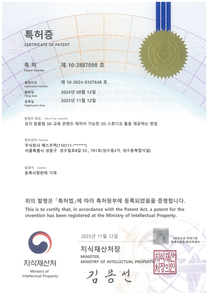 서우승 베스트텍 대표는 “이번 특허 출원은 교사와 학생이 직접 3D 학습 자료를 제작하는 차세대 XR 교육 구조를 제시한 기술적 성과”라며 “AI·XR 융합 기반의 맞춤형 콘텐츠 제작 생태계를 구축해 에듀스페이스 글로벌 확장을 가속하겠다”고 말했다.