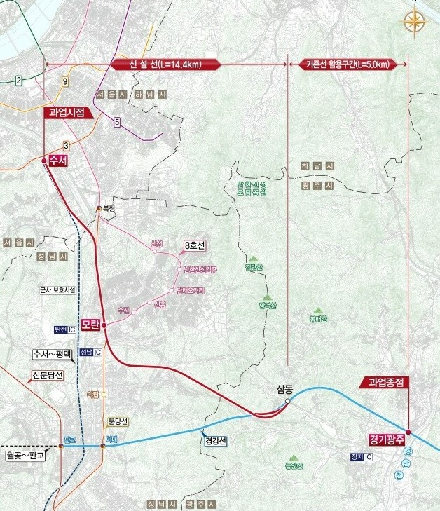 수서-광주 복선전철 사업은 총 사업비 1조1103억원을 투입해 오는 2030년 완공이 목표다. 이 구간은 총 19.4㎞로, 수서-삼동(14.4㎞)은 복선으로 신설하고 삼동-경기광주(5㎞)는 기존선을 활용할 예정이다. 정거장은 2개소(수서, 모란)가 새롭게 조성되고, 기존 1개소(경기광주)는 개량될 예정이다.