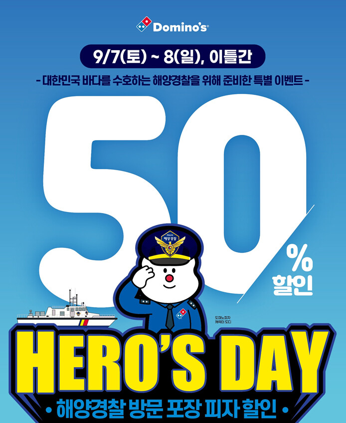 [하비엔뉴스 = 한시은 기자] 도미노피자는 해양경찰의 날(9월10일)을 앞두고 전국의 모든 해양경찰을 대상으로 한 ‘해양경찰 히어로즈데이’ 프로모션을 진행한다고 2일 밝혔다.