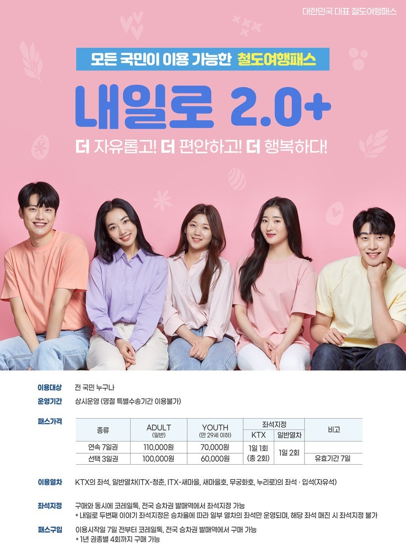 ‘내일로’는 7일권과 3일권 중 선택해 KTX를 포함한 모든 열차를 이용할 수 있는 자유여행패스다. KTX는 1일 1회(기간 내 총 2회), 일반열차는 1일 2회까지 좌석지정이 가능하고, 일반열차의 경우 입석과 자유석까지 이용할 수 있다.