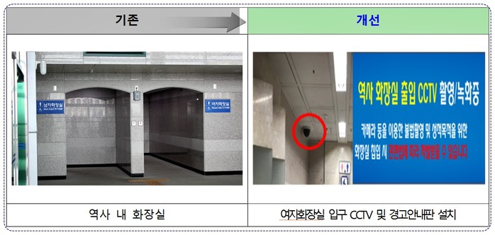 공단은 역사 내 성범죄 예방을 위하여 여성화장실 입구에 방범용 CCTV와 경고안내판을 설치했다.