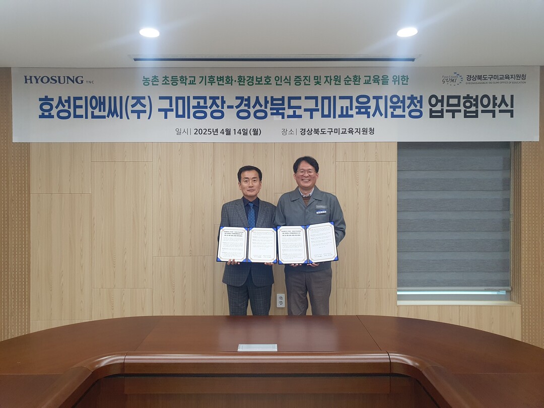 효성티앤씨는 지난 14일 경북 구미교육지원청과 구미 지역 농촌 초등학생 대상 환경교육 활성화를 위한 업무협약(MOU)을 체결했다고 15일 밝혔다.