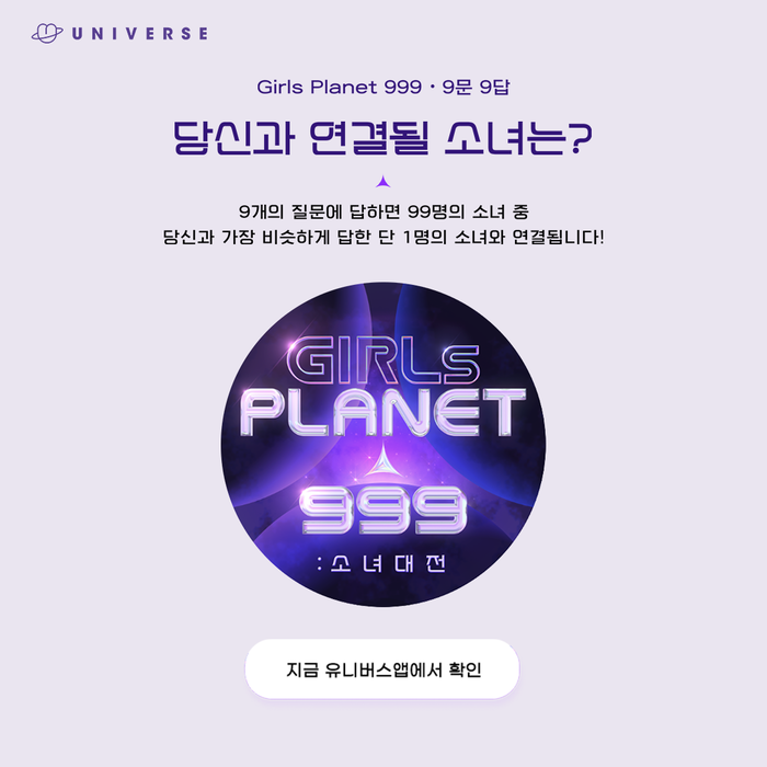 27일 글로벌 K-POP(케이팝) 엔터테인먼트 플랫폼 ‘유니버스(UNIVERSE)’가 Mnet(엠넷)의 글로벌 프로젝트 ‘걸스플래닛999 : 소녀대전(Girls Planet 999, 이하 걸스플래닛999)’의 ‘9문 9답’ 이벤트를 오픈한다.