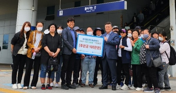 | 26일 유성기 국가철도공단 호남본부장(가운데 오른쪽)이 재가장애인들의 기차여행을 위한 후원금을 전달한 후 기념촬영을 하고 있다. [사진=국가철도공단] |