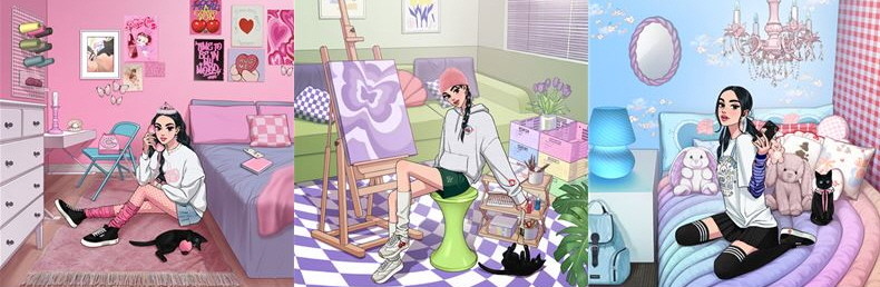 화보 속 지지는 핑크 톤·파스텔 민트 톤·하늘색 톤 각각의 방에 어울리는 키르시의 S/S 시즌 아이템을 입고 다양한 매력을 뽐내고 있다. 특히 지지의 하이틴 감성이 담긴 인테리어와 키르시의 아이템들이 한데 어우러져 눈길을 끈다.