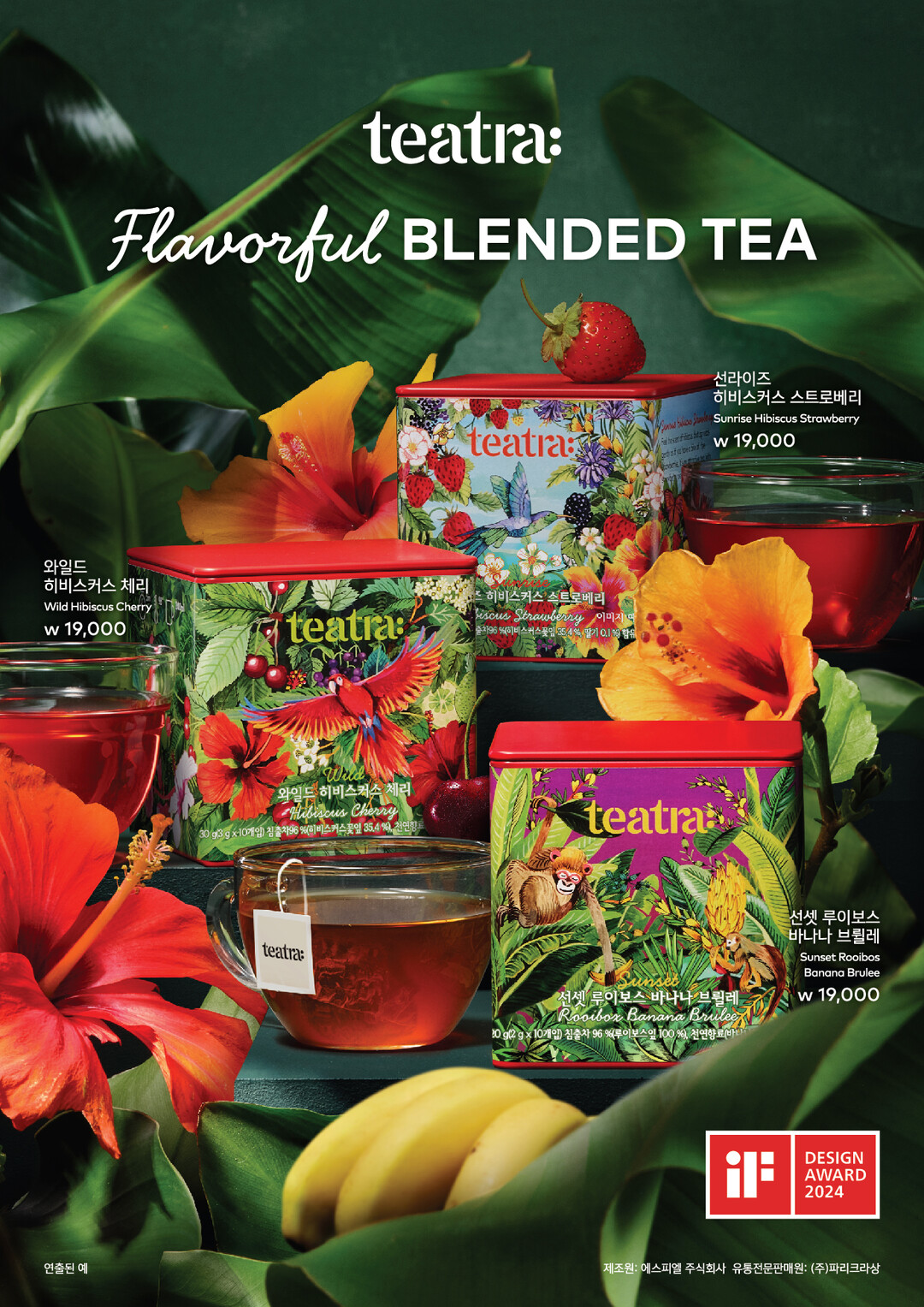 패키지 부분에서 수상한 티트라 제품은 ‘프리미엄 블렌딩티 3종’(와일드 히비스커스 체리, 선라이즈 히비스커스 스트로베리, 선셋 루이보스 바나나 브릘레)으로, 패키지 일러스트는 영국인 아티스트 그룹 ‘Good wives and warriors(UK)’과 협업해 완성했다.