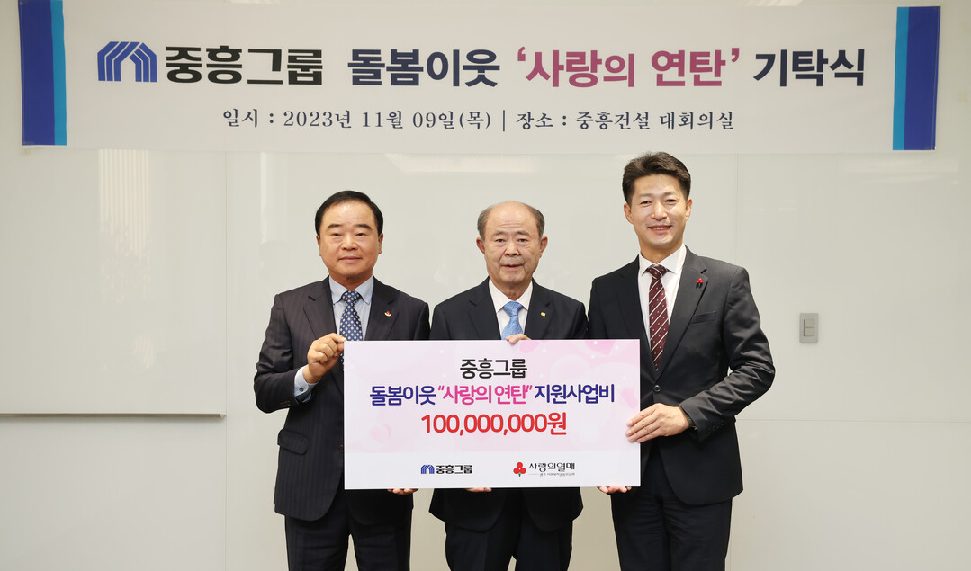 중흥그룹은 9일 광주광역시 북구 소재 중흥건설 본사 대회의실에서 ‘사랑의 연탄’ 성금 기탁식을 열고, 광주사회복지공동모금회에 1억원을 전달했다고 밝혔다.