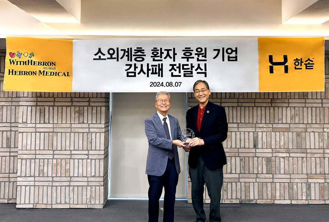 이에 김우정 헤브론의료원장은 이날 후원에 감사를 표하기 위해 이하림 한솥도시락 대표에게 감사패를 전달했다.