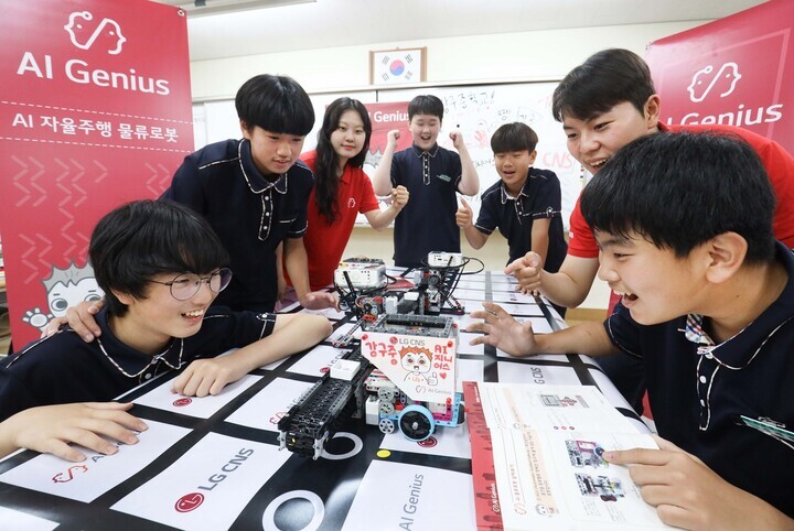 LG CNS는 최근 경북 영덕에 위치한 강구중학교를 찾아 AI지니어스를 진행했다. 이날 행사에서는 강구·병곡중학교 학생 약 60명이 프로그램에 참여해 AI 물류 로봇과 AI 챗봇 등에 대해 배우고 이를 응용해 서비스를 직접 만들었다.