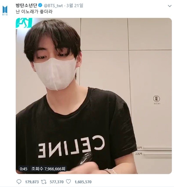 방탄소년단 공식 트위터는 최근 “난 이노래가 좋더라”라는 문구와 함께 뷔의 동영상을 게재했다.