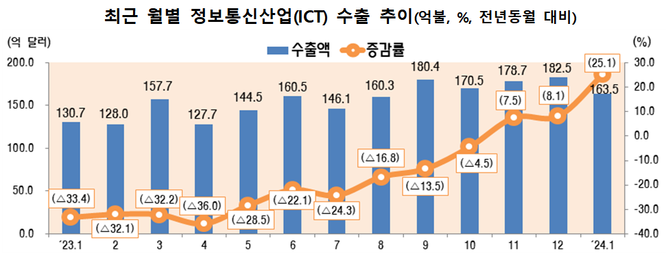 앞서 지난해 11월과 12월 ICT 수출 증감률은 각각 7.5%, 8.1%였고, 같은 기간 반도체 수출 증감률은 10.7%, 19.3%를 기록했다.