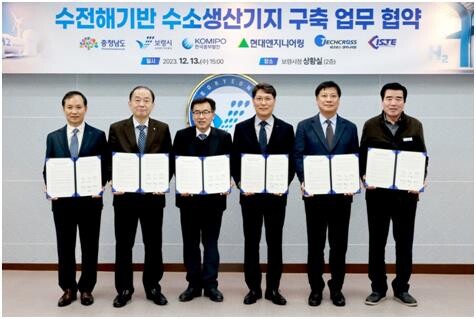 현대엔지니어링은 지난 13일 충남도청, 보령시청, 한국중부발전, 테크로스 워터앤에너지, 아이에스티이 등과 ‘보령 수전해 기반 수소 생산기지 구축’ 사업 협약서를 체결했다고 14일 밝혔다.