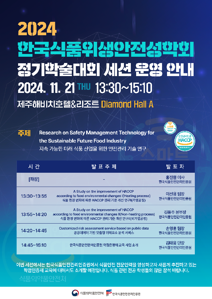 해썹인증원은 이번 정기학술대회(21일)에서 ‘지속 가능한 미래 식품 산업을 위한 안전관리 기술 연구’를 주제로 ▲식품 환경 변화에 따른 해썹 관리 기준 개선 연구(가열공정, 소독공정 중요관리점 재검토) ▲공공데이터 기반 맞춤형 위해요소 분석 서비스 등에 대해 발표할 예정이다.