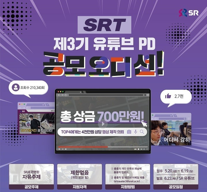[하비엔=문기환 기자] SRT 운영사인 SR은 오는 6월19일까지 ‘SR 유튜브 PD’ 공개모집 오디션을 진행한다.