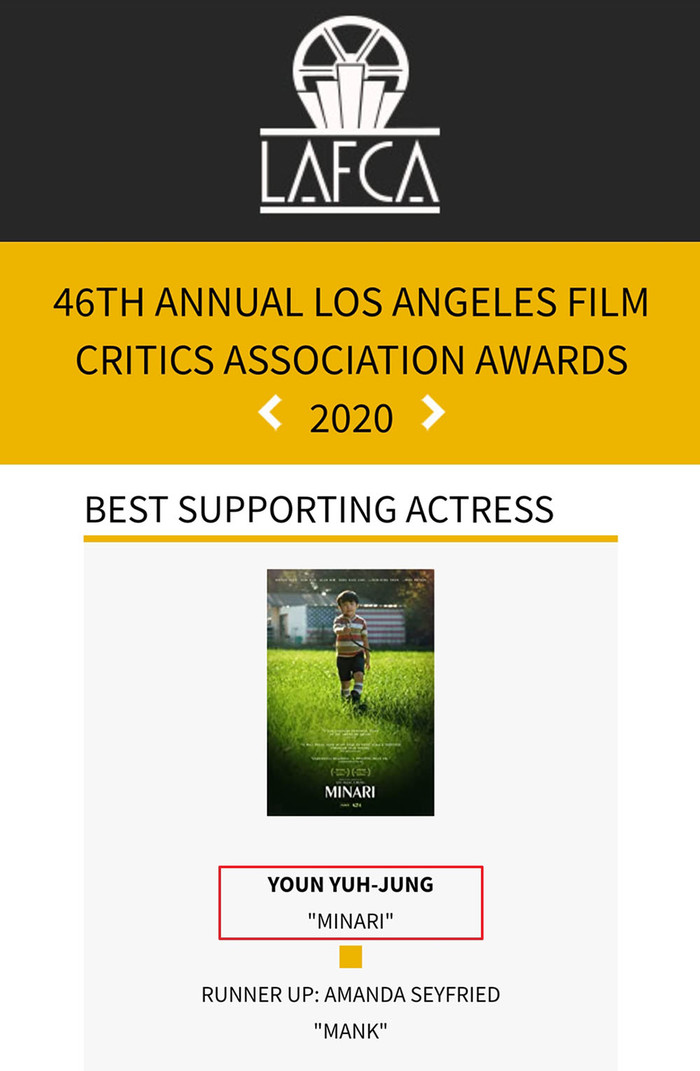 [하비엔=노이슬 기자] 2021 오스카 유력 후보작으로 예측되는 <미나리>가 LA 비평가협회(LA Film Critics Association, LAFCA)에서 여우조연상을 수상하는 쾌거를 이뤘다. 또한 보스턴 온라인 비평가협회에서 선정한 '올해의 영화 TOP10'에도 이름을 올려 화제다.