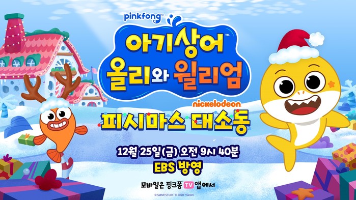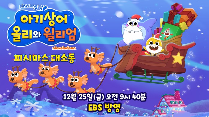지난 11일(미국 서부 기준) 미국 니켈로디언 채널을 통해 최초 공개된 ‘베이비샤크 빅 쇼’ 크리스마스 스페셜 영상은 오는 25일 오전 9시 40분 EBS에서 ‘아기상어 올리와 윌리엄: 피시마스 대소동’이라는 제목으로 방영되며, 이날 오후 2시에는 핑크퐁 TV 앱을 통해서도 만나볼 수 있다.
