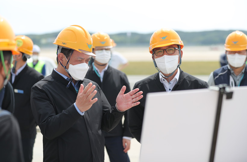 | ▲ 지난 11일 김경록 인천공항공사 사장(왼쪽)이 인천공항 제2여객터미널 계류장에 새롭게 건설한 ‘원격탑승교’를 둘러보고 있다. |