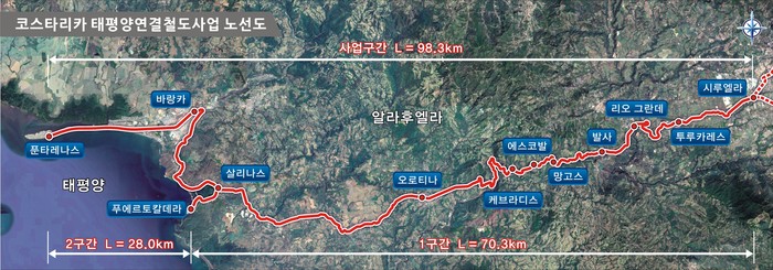 이번 용역은 코스타리카 수도권지역인 산호세와 태평양 연안의 푼타레나스를 연결하는 철도노선(98.3km) 복원사업으로 공단은 국내기업(동일기술공사, 수성엔지니어링)과 공동으로 참여해 현지 시장분석, 환경평가 등 사업의 타당성 여부를 검증하게 된다.