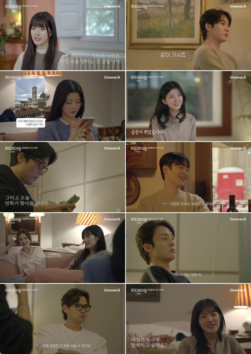 ‘하트페어링’은 이제는 결혼하고 싶은 청춘남녀들이 ‘썸’을 넘어 자신의 결혼 상대를 찾기 위해 진지한 ‘페어링’에 나서는 연애 예능. 청순 매력녀 ‘제연’을 사이에 둔 우재-지민의 삼각관계를 비롯해 찬형X하늘의 굳건한 페어링, ‘메기남’ 창환의 강렬한 등장까지 이탈리아에서의 얽히고설킨 러브라인을 그리며 서울까지 이어지는 드라마틱한 서사에 시동을 걸고 있다.