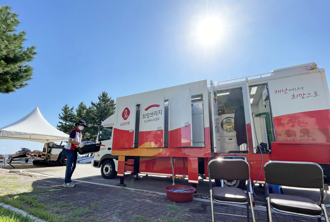 이번 세탁구호 현장에는 롯데그룹의 후원으로 제작된 5.5톤 규모의 특수 이동형 세탁차량이 투입됐다. 차량에는 18kg 대형 세탁기 3대와 23kg 대형 건조기 3대가 탑재돼 있으며, 하루 8시간 기준 약 1,000kg의 의류와 이불 등을 현장에서 직접 세탁·건조할 수 있다.